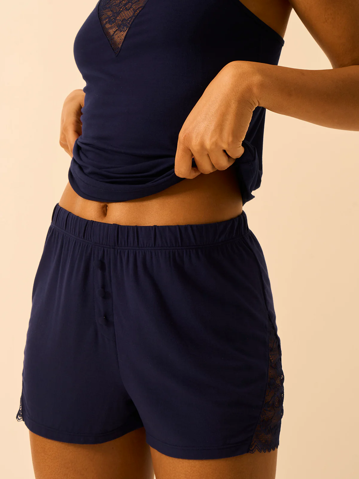Slip into something you’ll actually want to live in. Our Eco Lace Pajama Shorts in Navy takes classic nightwear and wraps it in sumptuously soft, ultra-breathable fabric that keeps you cool, comfy, and undeniably cosy. Perfect for slow Sunday mornings, indulgent lazy days, or night after night of pure lounging luxury - these pyjamas are as good in bed as they are out of it (if you want them to be).