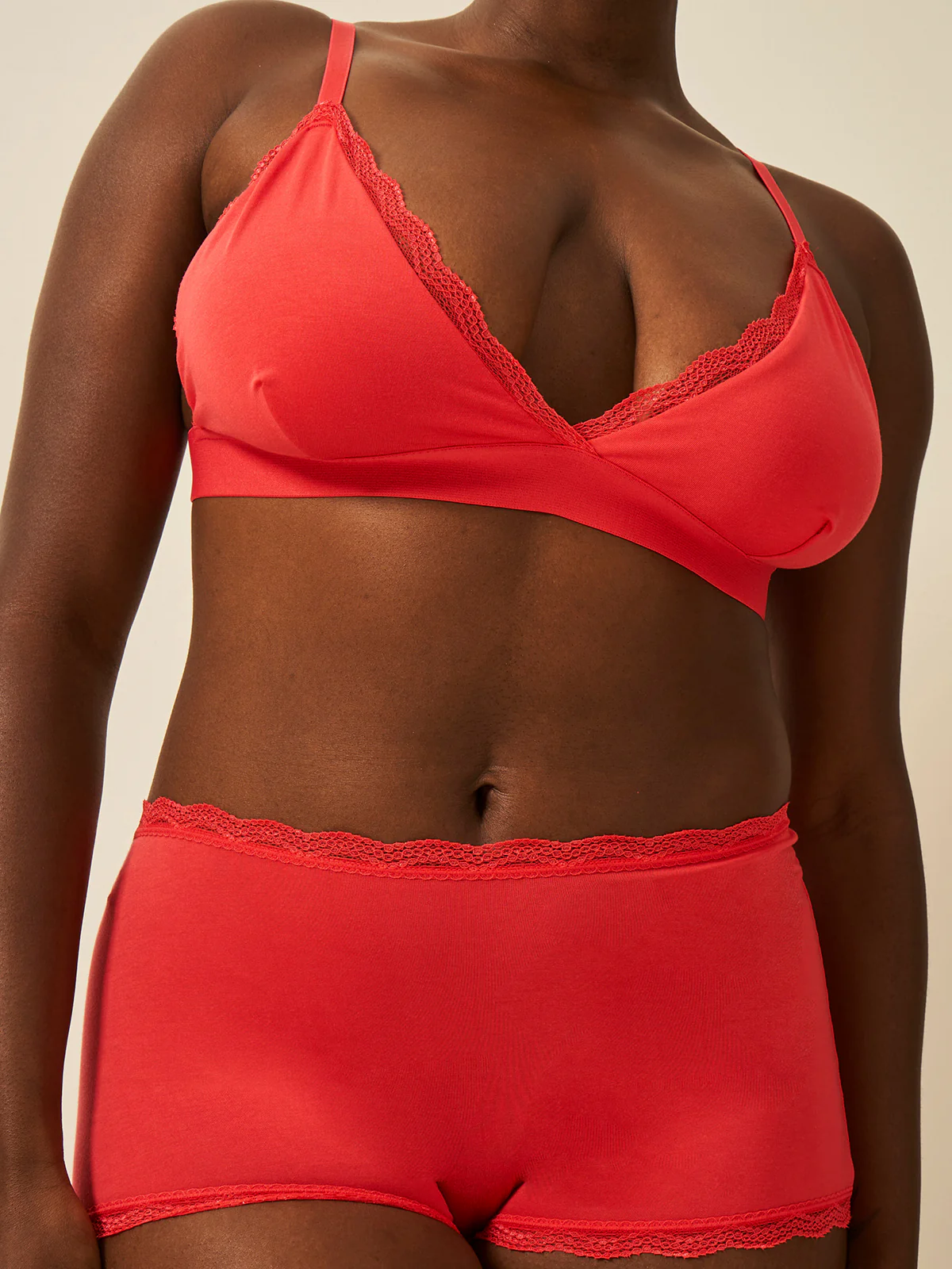 The Lace Bralette in Hibiscus - soft, breathable, and cloud-level comfortable. Featuring a delicate triangle shape with signature lace trim, it offers gentle support and a naturally feminine silhouette. Perfect for layering, it’s comfort and effortless style in one piece. So good, you might start wondering why all bras aren’t like this.