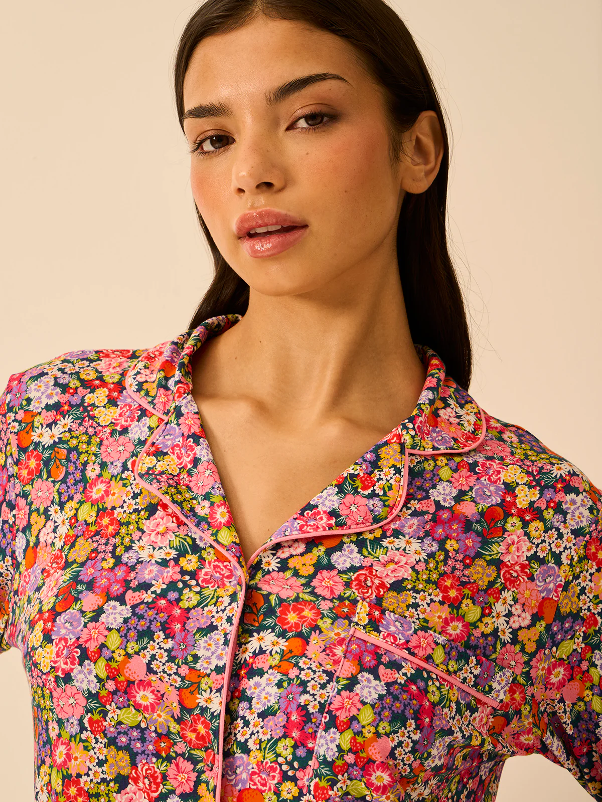 • Relaxed fit with contrast piping, button-front top and functional pocket