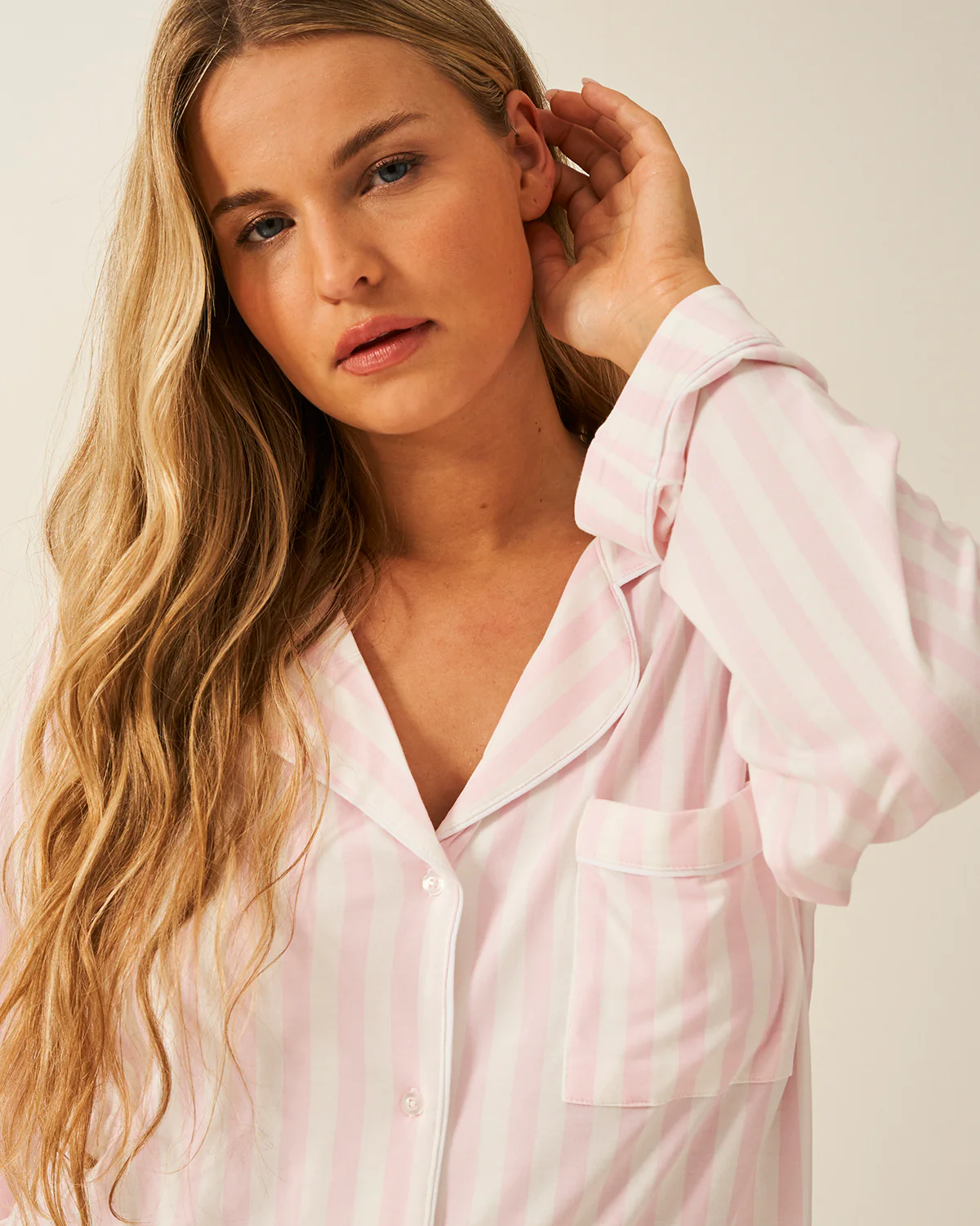 Meet your new night-time obsession. Our Long Pajama Set in Pale Pink Stripe, designed to elevate every night-time ritual, slow Sunday morning, and indulgent lazy day. Made from sumptuously soft, ultra-breathable fabric that keeps you cool and comfortable all night long, this set transforms every moment into pure indulgence. Feels so good, going out stops sounding like a good idea.