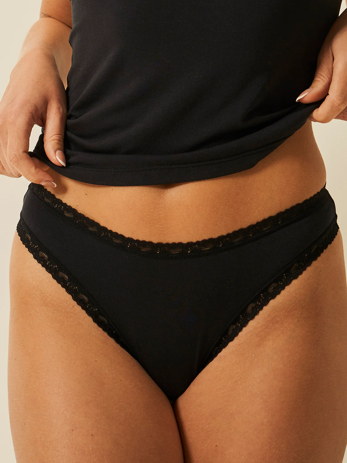 Treat your cheeks to the Thong in Black - sleek, soft, and designed to disappear. Minimal coverage with a low rise and streamlined silhouette, this style sits smooth across the hips and stays in place without digging or shifting. Might cause mild panic that you’ve gone commando.